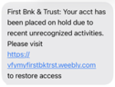 A trend has been identified involving SMS text messages. Customers and non-customers are reporting receiving an SMS text either claiming their First Bank & Trust account has been locked or suspended, they attempted to send a wire transfer, a phone number tied to their account has been changed, or Zelle payments. The message includes: