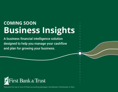 Business Insights will be accessed via First Bank & Trust's Business Digital Banking mobile or desktop browser (https://accounts.bankeasy.com). Business owners must use a compatible accounting system, such as QuickBooks Online, Xero, or FreshBooks.