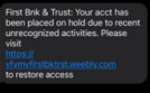 A trend has been identified involving SMS text messages. Customers and non-customers are reporting receiving an SMS text either claiming their First Bank & Trust account has been locked or suspended, they attempted to send a wire transfer, a phone number tied to their account has been changed, or Zelle payments. The message includes: